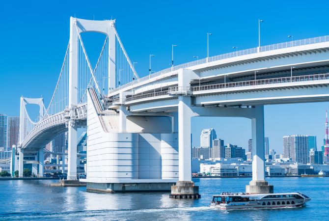 有時候,橋不僅是將您從一個地方帶到另一個地方。連接陸地和人工小島台場 的彩虹大橋本身就是一個亮眼的景點。這座大橋修建於 20 世紀 90 年代,使得東京灣的這一區域繁榮發展,並成為了頂級旅遊景點的彙聚之地。